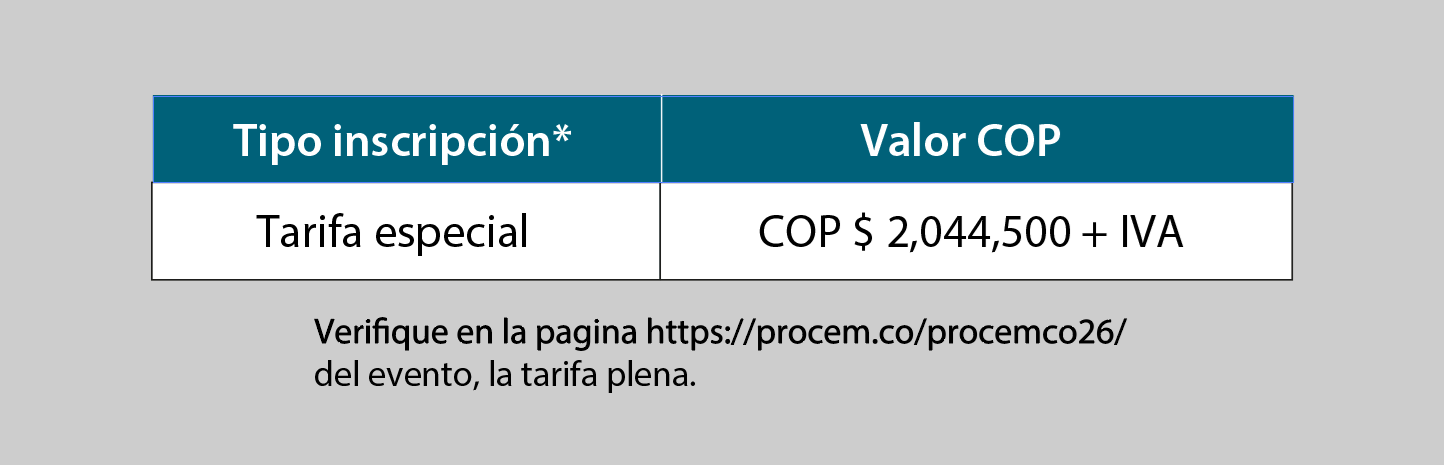 La pieza promocional del evento muestra una tarifa especial de COP $2.044.500 + IVA y aclara que la tarifa plena debe verificarse en la página oficial del evento. También remite al sitio www.procem.co y específicamente a la página del evento para consultar condiciones y detalles actualizados.